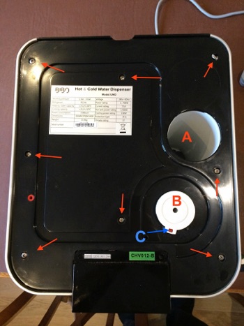 1. Isolate the water supply to the Bibo and drain what water will come out from the system by opening either the hot or cold tap. This takes the pressure out of the internal piping. If you want to first check that your leak has the same cause as mine before commencing the repair, leave the water connected but off during disassembly. Once the PRV is revealed you can turn the water on and see if you have the same leak as I had.