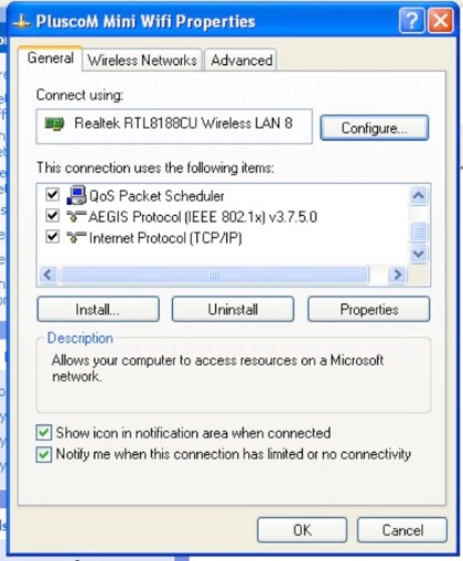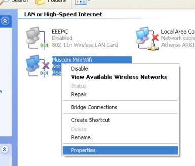 ... and right-click on the relevant adaptor (the Pluscom one in my case) and click on Properties’. If it isn’t there, it has not been installed correctly.