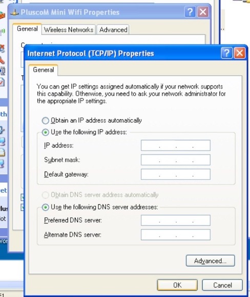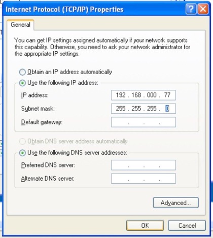 Click on ‘Use the following IP address;” and enter what ever you want as long as all of the entries are between 0 and 255 and the first 9 are dissimilar to your LAN’s. When you click on the subnet mask it will populate automatically. You can change this or leave as is. Leave the other boxes empty and click ‘OK’.
