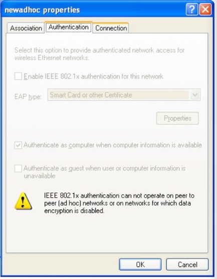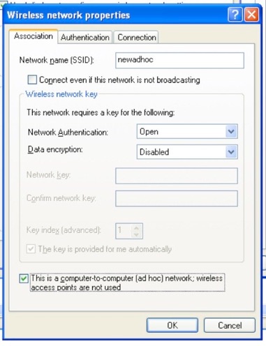 ... and give your ad hoc network a suitable name, eg NewAdHoc, leave ‘Connect Even if...’ un-ticked, ensure Network Authentication is Open, Data encryption as you wish (but if you choose something I have only tried WEP and you will have to pick a suitable key) and most important, tick the ‘This is a computer-to-computer....’ tick box.